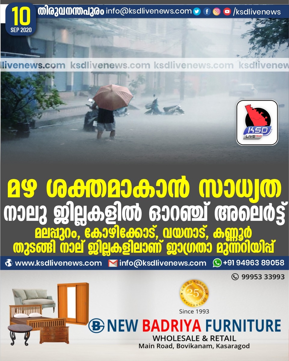 കേരളം മഴ ശക്തമാകാൻ സാധ്യത ;നാലു ജില്ലകളിൽ ഓറഞ്ച് അലെർട്ട് ;മലപ്പുറം, കോഴിക്കോട്, വയനാട്, കണ്ണൂർ തുടങ്ങി നാല്ജില്ലകളിലാണ് ജാഗ്രതാ മുന്നറിയിപ്പ് .September 10, 2020