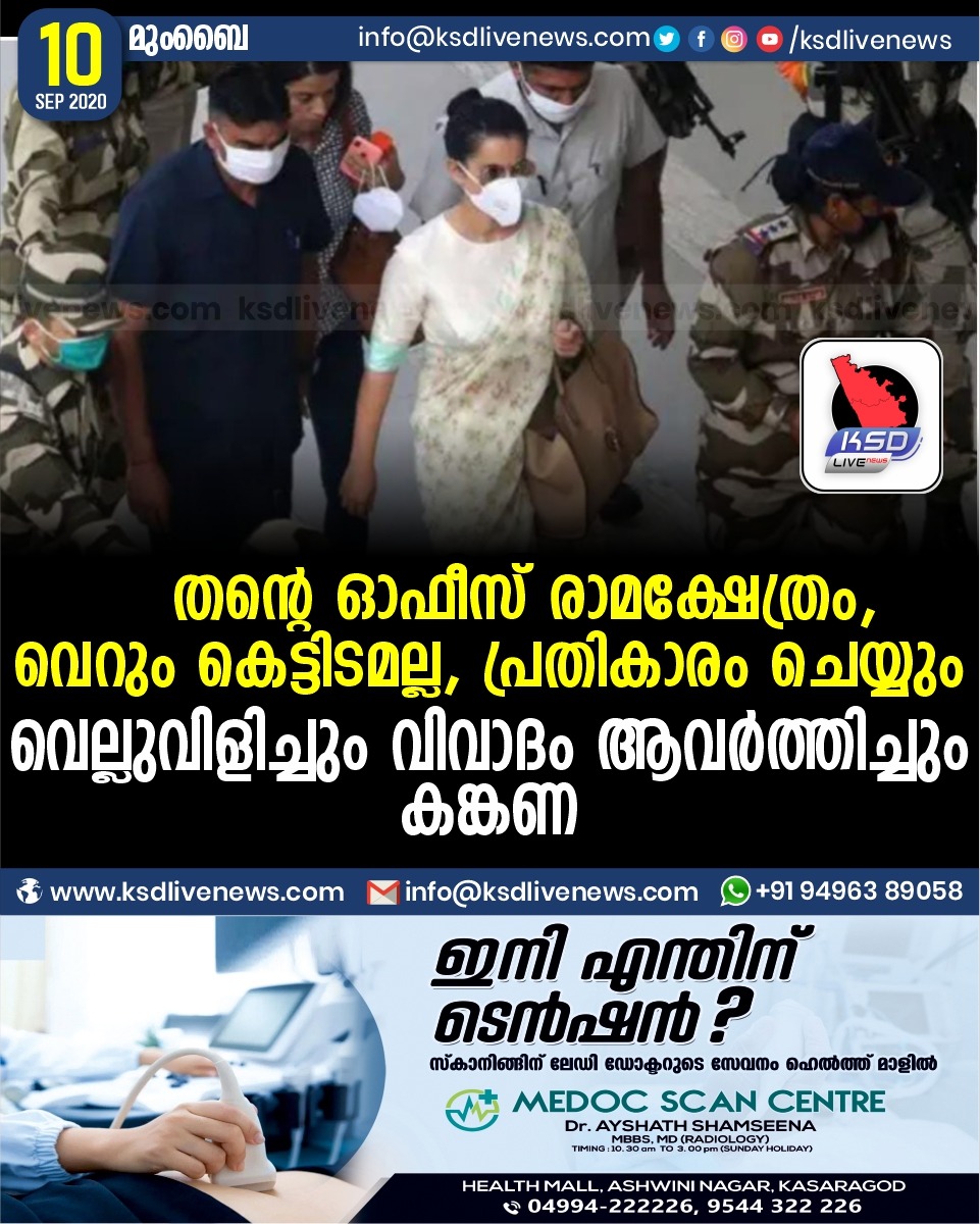 ദേശീയം ” തന്റെ ഓഫീസ് രാമക്ഷേത്രം , വെറും കെട്ടിടമല്ല , പ്രതികാരം ചെയ്യും ” ; വെല്ലുവിളിച്ചും വിവാദം ആവർത്തിച്ചും കങ്കണSeptember 10, 2020