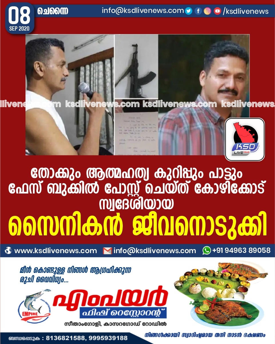 കേരളം തോക്കും ആത്മഹത്യ കുറിപ്പും പാട്ടും ഫേസ് ബുക്കിൽ പോസ്റ്റ് ചെയ്ത് കോഴിക്കോട് സ്വദേശിയായ സൈനികൻ ജീവനൊടുക്കിSeptember 8, 2020