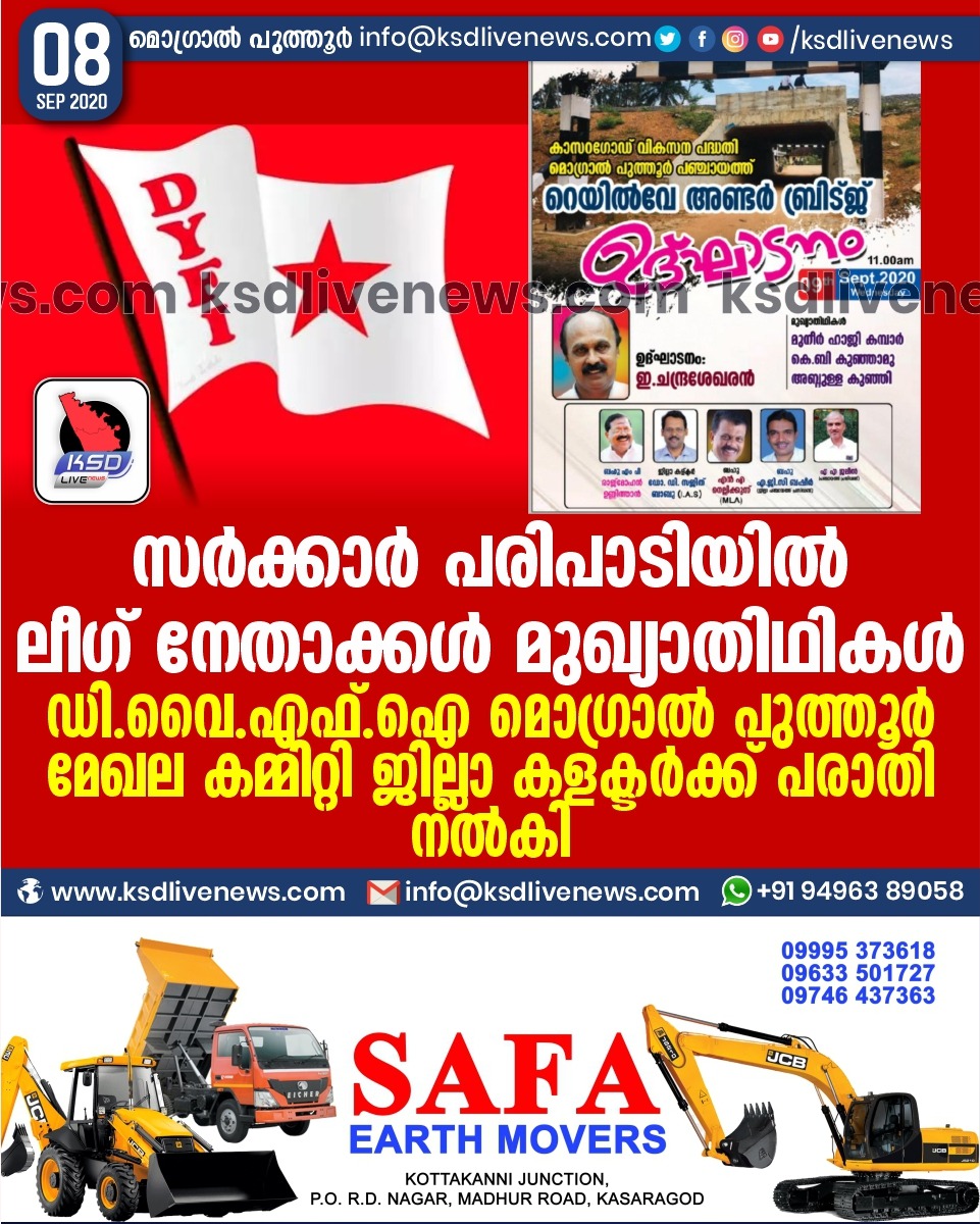 പ്രാദേശികം സർക്കാർ പരിപാടിയിൽ ലീഗ് നേതാക്കൾ മുഖ്യാതിഥികൾ ; ഡി.വൈ.എഫ്.ഐ മൊഗ്രാൽ പുത്തൂർ മേഖല കമ്മിറ്റി ജില്ലാ കളക്ടർക്ക് പരാതി നൽകിSeptember 8, 2020