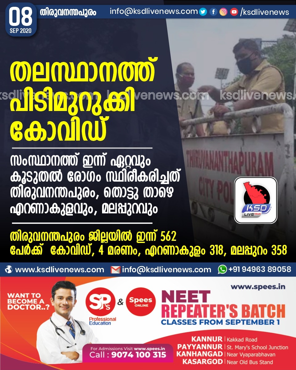 കേരളം തലസ്ഥാനത്ത് പിടിമുറുക്കി കോവിഡ്സംസ്ഥാനത്ത് ഇന്ന് ഏറ്റവും കൂടുതൽ രോഗം സ്ഥിരീകരിച്ചത് തിരുവനന്തപുരം, തൊട്ടു താഴെ എറണാകുളവും, മലപ്പുറവുംതിരുവനന്തപുരം ജില്ല യിൽ ഇന്ന് 562 പേർക്ക് കോവിഡ്, 4 മരണംഎറണാകുളം 318 , മലപ്പുറം 358September 8, 2020