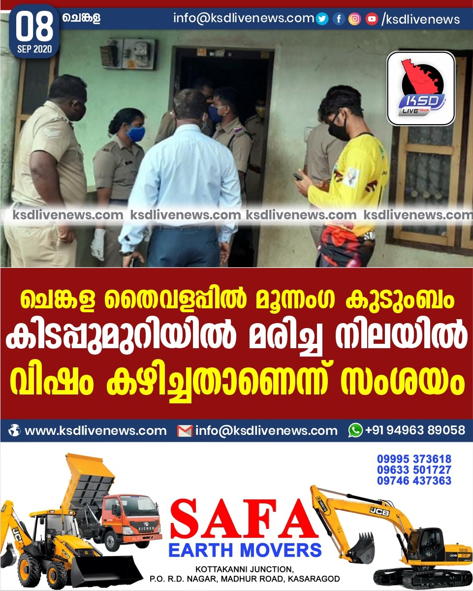 പ്രാദേശികം ചെങ്കള തൈവളപ്പില് മൂന്നംഗ കുടുംബം കിടപ്പുമുറിയില് മരിച്ച നിലയില്; വിഷം കഴിച്ചതാണെന്ന് സംശയംSeptember 8, 2020