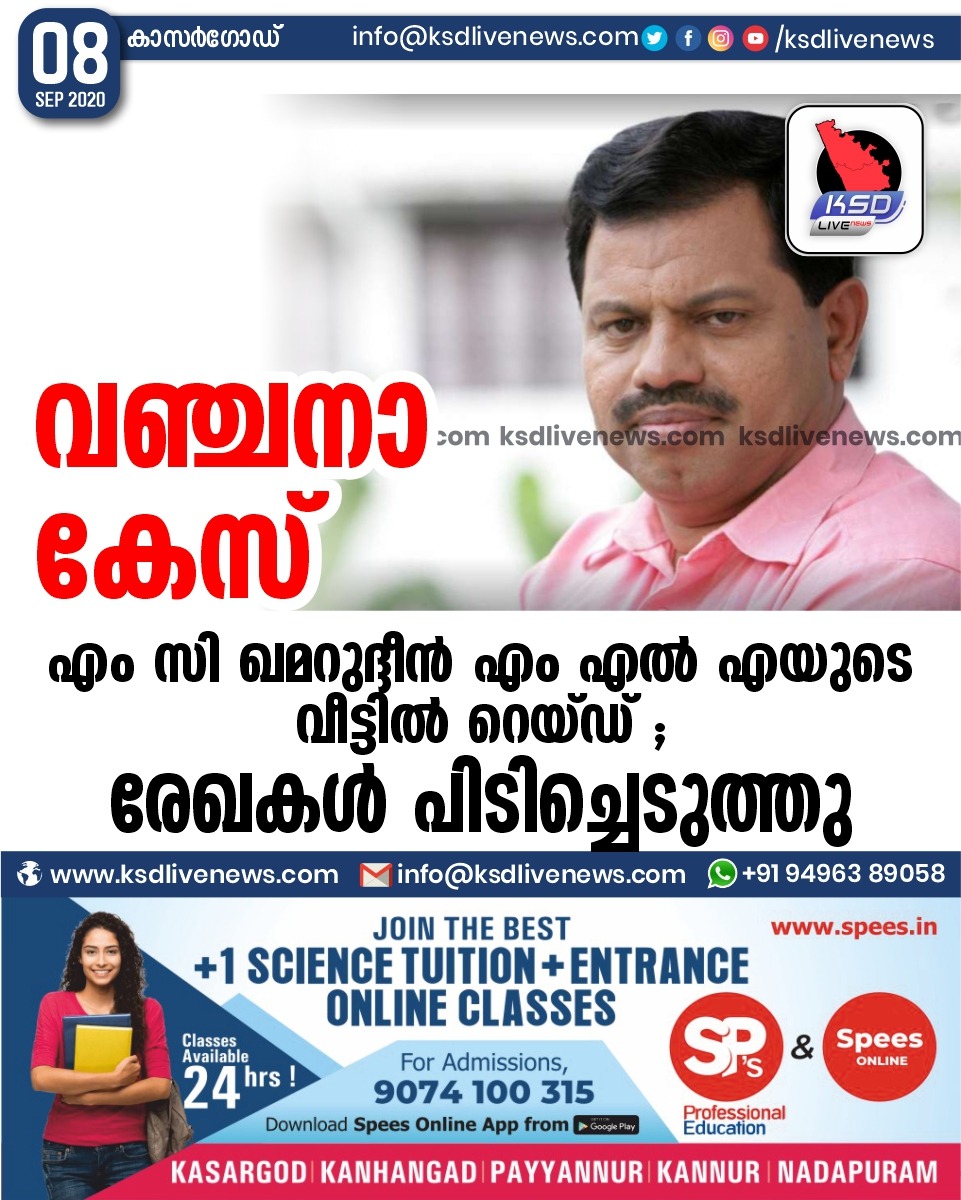 പ്രാദേശികം വഞ്ചനാ കേസ് എം സി ഖമറുദ്ദീൻ എം എൽ എയുടെ വീട്ടിൽ റെയ്ഡ് ; രേഖകൾ പിടിച്ചെടുത്തുSeptember 8, 2020