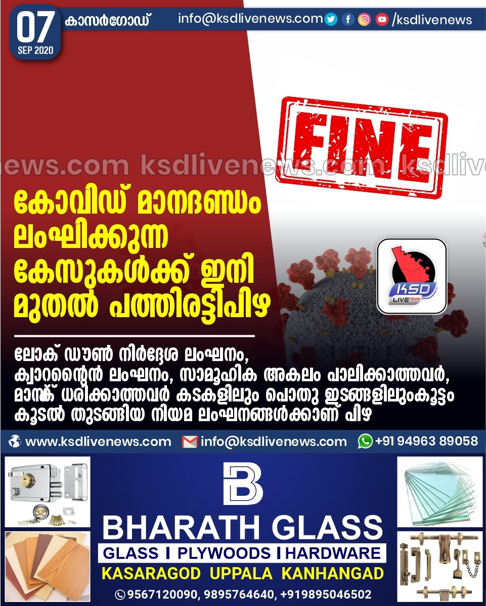കേരളം കോവിഡ് മാനദണ്ഡം ലംഘിക്കുന്ന കേസുകൾക്ക് ഇനി മുതൽ പത്തിരട്ടിപിഴലോക് ഡൗണ് നിര്ദ്ദേശ ലംഘനം, ക്വാറന്റൈന് ലംഘനം, സാമൂഹിക അകലം പാലിക്കാത്തവര്, മാസ്ക് ധരിക്കാത്തവര് കടകളിലും പൊതു ഇടങ്ങളിലുംകൂട്ടം കൂടൽ തുടങ്ങിയ നിയമ ലംഘനങ്ങള്ക്കാണ് പിഴSeptember 7, 2020