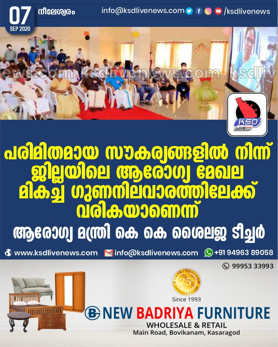കേരളം പരിമിതമായ സൗകര്യങ്ങളിൽ നിന്ന് ജില്ലയിലെ ആരോഗ്യ മേഖല മികച്ച ഗുണനിലവാരത്തിലേക്ക് വരികയാണെന്ന് -ആരോഗ്യ മന്ത്രി കെ കെ ശൈലജ ടീച്ചർSeptember 7, 2020
