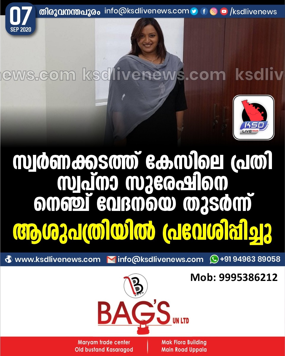 കേരളം സ്വർണക്കടത്ത് കേസിലെ പ്രതി സ്വപ്നാ സുരേഷിനെ നെഞ്ച് വേദനയെ തുടർന്ന് ആശുപത്രിയിൽ പ്രവേശിപ്പിച്ചുSeptember 7, 2020