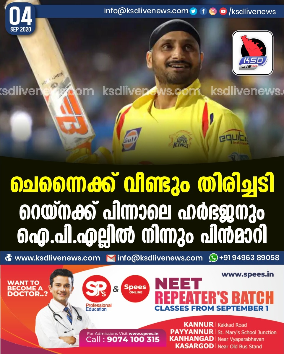 ദേശീയം ചെന്നൈക്ക് വീണ്ടും തിരിച്ചടി : റെയ്നക്ക് പിന്നാലെ ഹർഭജനും ഐ.പി.എല്ലിൽ നിന്നും പിൻമാറിSeptember 4, 2020