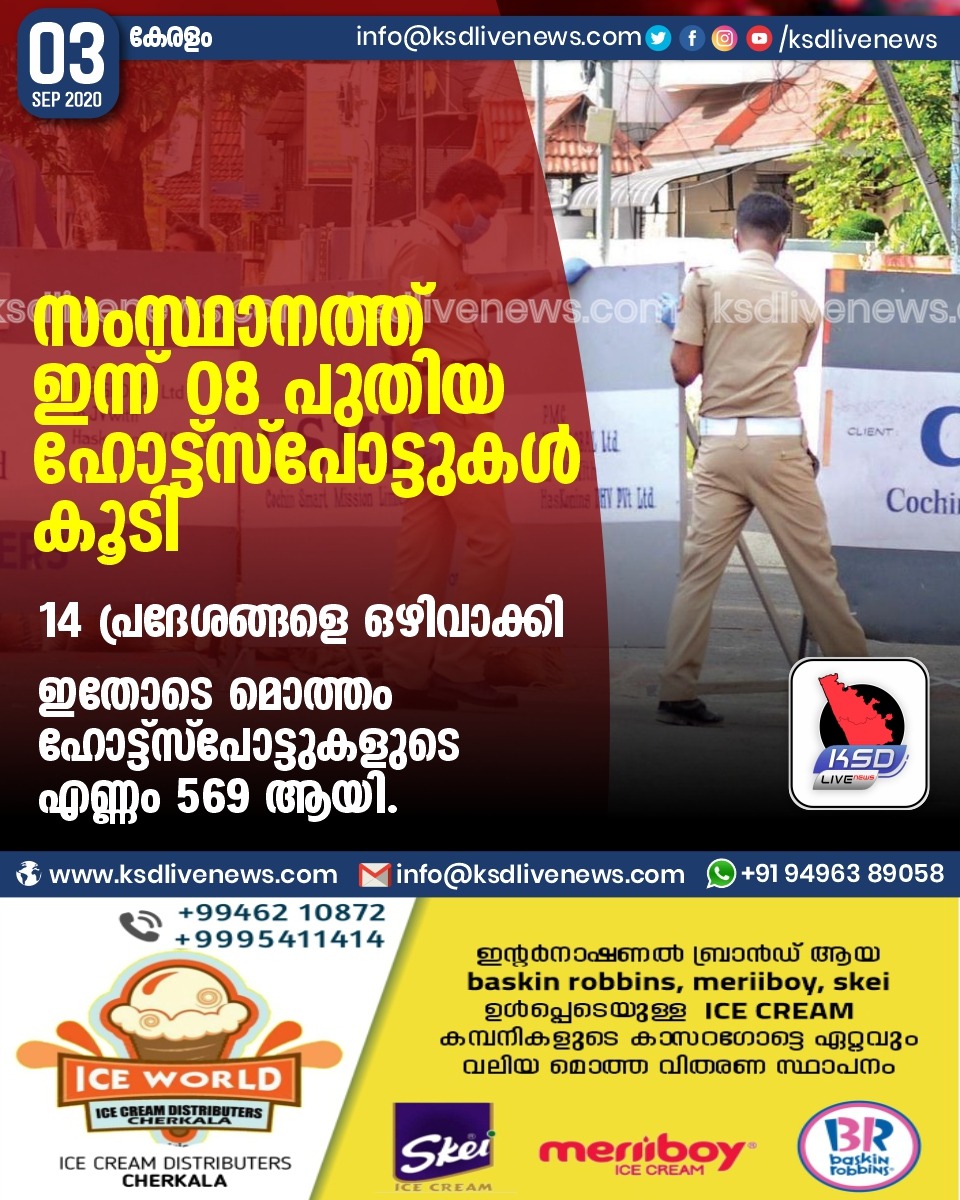 കേരളം സംസ്ഥാനത്ത് ഇന്ന് 8 പുതിയ ഹോട്ട്സ്പോട്ടുകള് കൂടി; 14 പ്രദേശങ്ങളെ ഒഴിവാക്കി.ഇതോടെ മൊത്തം ഹോട്ട്സ്പോട്ടുകളുടെ എണ്ണം 569 ആയി.September 3, 2020