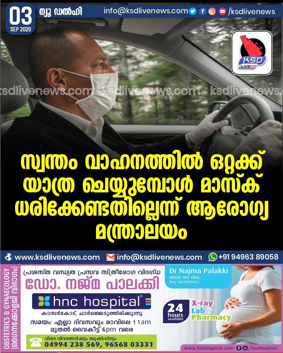 ദേശീയം സ്വന്തം വാഹനത്തില് ഒറ്റക്ക് യാത്ര ചെയ്യുമ്പോള് മാസ്ക് ധരിക്കേണ്ടതില്ലെന്ന് ആരോഗ്യ മന്ത്രാലയംSeptember 3, 2020