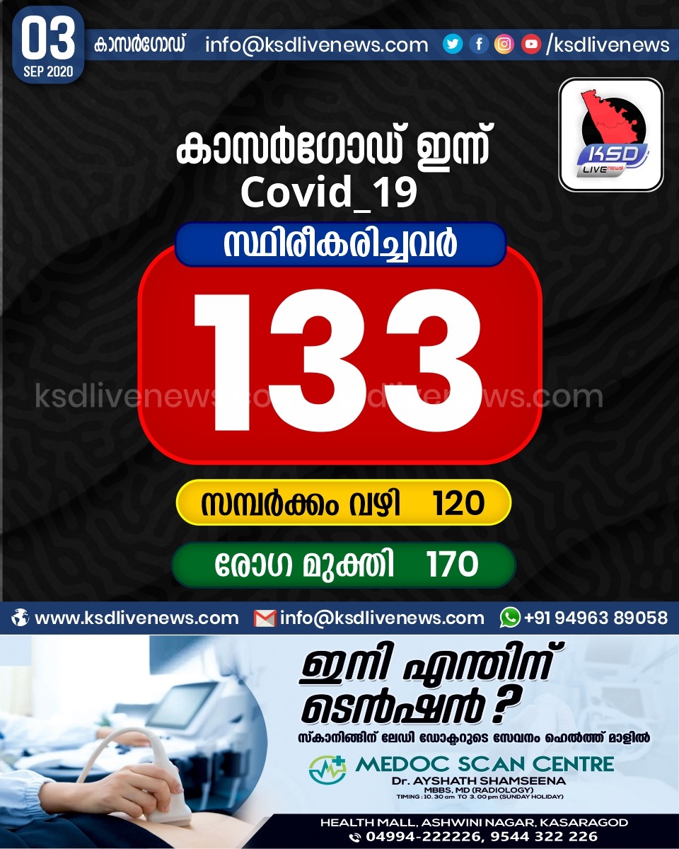 เดชเตเดฐเดพเดฆเตเดถเดฟเดเด เดเดพเดธเตผเดเตเดกเต เดเดฟเดฒเตเดฒเดฏเดฟเตฝ เดเดจเตเดจเต 133 เดชเตเตผเดเตเดเต เดเตเดตเดฟเดกเต เดธเตเดฅเดฟเดฐเตเดเดฐเดฟเดเตเดเต. เดธเดฎเตเดชเตผเดเตเดเด เดตเดดเดฟ 120 เดชเตเตผเดเตเดเตเด.September 3, 2020