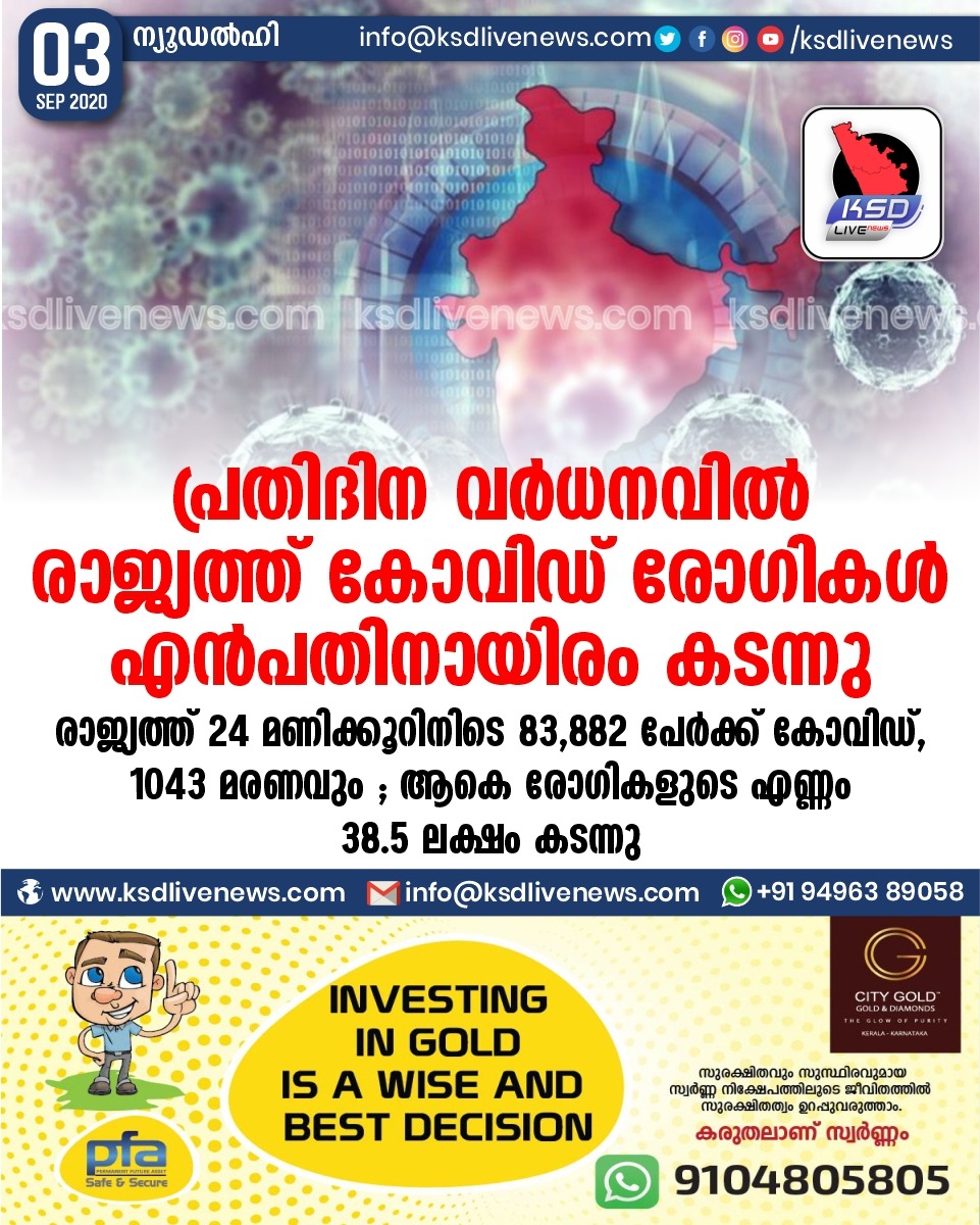 ദേശീയം പ്രതിദിന വർധനവിൽ രാജ്യത്ത് കോവിഡ് രോഗികൾ എൻപതിനായിരം കടന്നു ;രാജ്യത്ത് 24 മണിക്കൂറിനിടെ 83,882 പേർക്ക് കോവിഡ് ,1043 മരണവും ;ആകെ രോഗികളുടെ എണ്ണം 38.5 ലക്ഷം കടന്നുSeptember 3, 2020