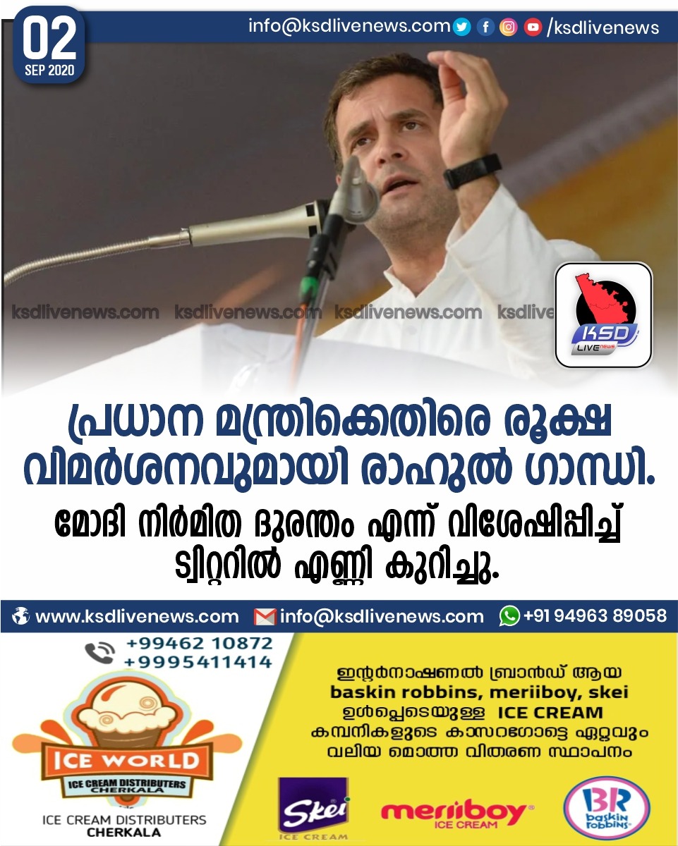 ദേശീയം പ്രധാന മന്ത്രിക്കെതിരെ രൂക്ഷ വിമർശനവുമായി രാഹുൽ ഗാന്ധി.മോദി നിർമിത ദുരന്തം എന്ന് വിശേഷിപ്പിച്ച് ട്വിറ്ററിൽ എണ്ണി കുറിച്ചു.September 2, 2020