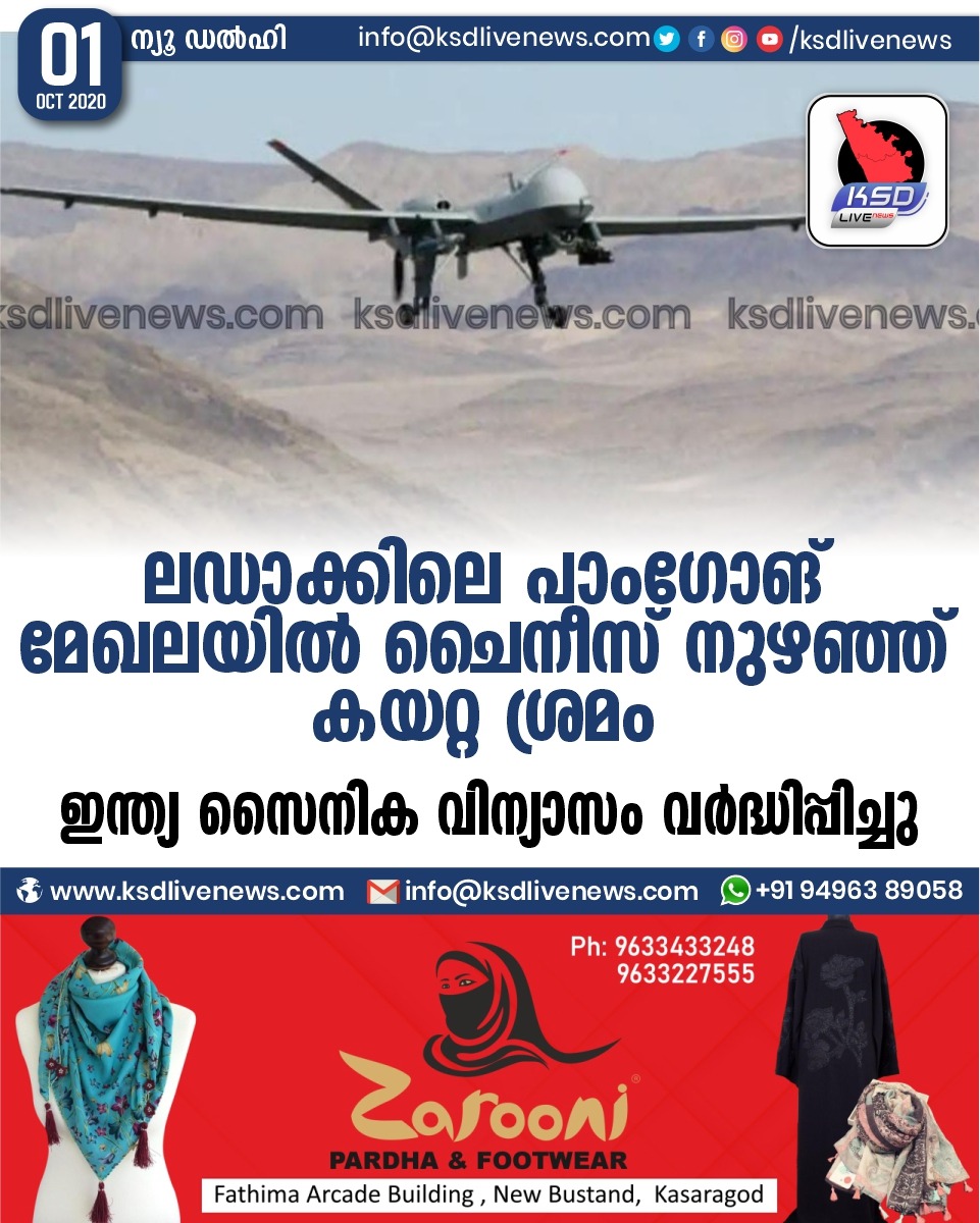 ദേശീയം ലഡാക്കിലെ പാംഗോങ് മേഖലയിൽ ചൈനീസ് നുഴഞ്ഞ് കയറ്റ ശ്രമം ; ഇന്ത്യ സൈനിക വിന്യാസം വർദ്ധിപ്പിച്ചുSeptember 1, 2020