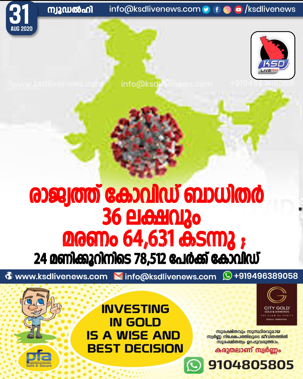 ദേശീയം രാജ്യത്ത് കോവിഡ് ബാധിതർ 36 ലക്ഷവും മരണം 64,631 കടന്നു ;24 മണിക്കൂറിനിടെ 78,512 പേർക്ക് കോവിഡ്August 31, 2020