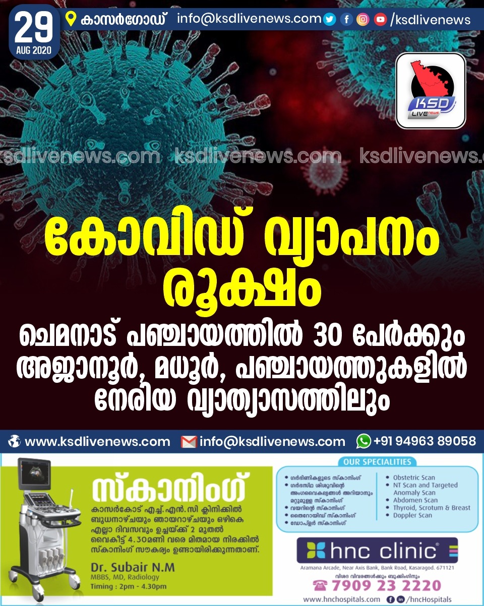 പ്രാദേശികം കോവിഡ് വ്യാപനം രൂക്ഷംചെമനാട് പഞ്ചായത്തിൽ 30 പേർക്കും അജാനൂർ, മധൂർ, പഞ്ചായത്തുകളിൽ നേരിയ വ്യാത്യാസത്തിലുംAugust 29, 2020