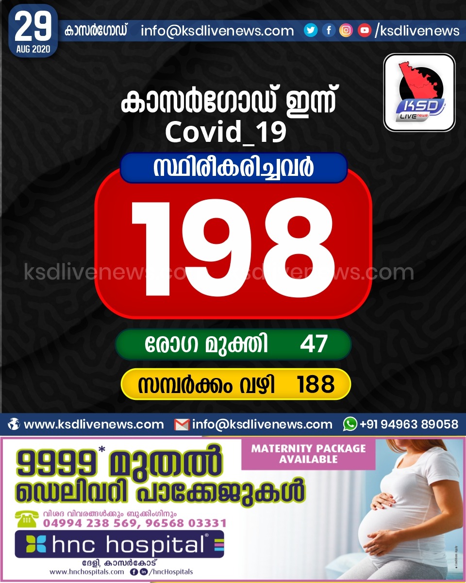 പ്രാദേശികം കാസർഗോഡ് ജില്ലയിൽ ഇന്ന് 198 പേർക്ക് കോവിഡ് സ്ഥിരീകരിച്ചു. സമ്പർക്കം വഴി 188 പേർക്കും. 47 പേർക്ക് രോഗ മുക്തിAugust 29, 2020
