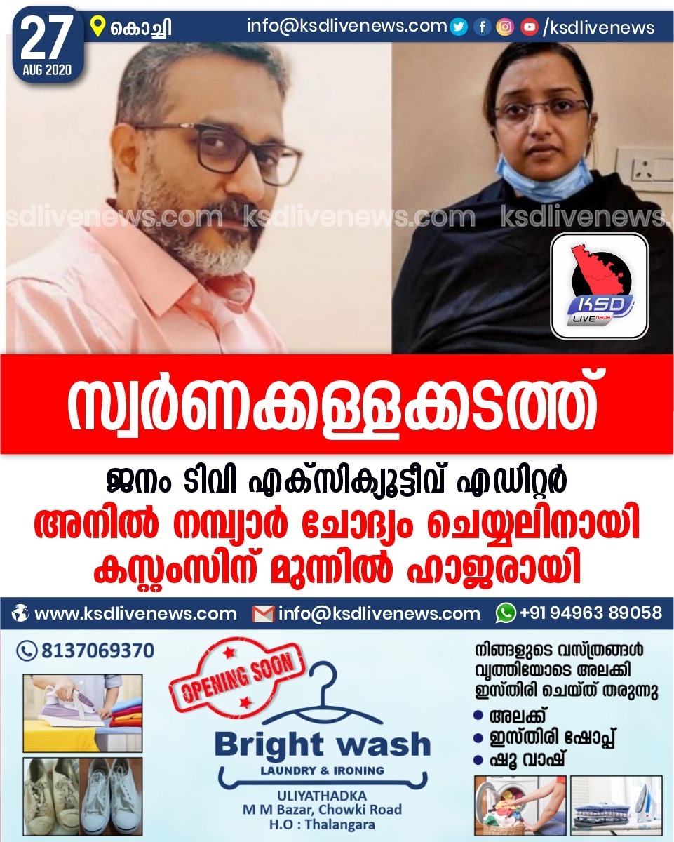 പ്രാദേശികം സ്വര്ണക്കള്ളക്കടത്ത്:ജനം ടിവി കോ- എക്സിക്യൂട്ടീവ് എഡിറ്റര് അനില് നമ്പ്യാര് ചോദ്യം ചെയ്യലിനായി കസ്റ്റംസിന് മുന്നില് ഹാജരായിAugust 27, 2020