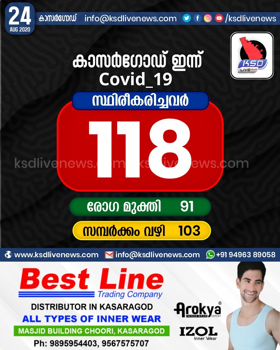 പ്രാദേശികം കാസർഗോഡ് ജില്ലയിൽ ഇന്ന് 118 പേർക്ക് കോവിഡ് സ്ഥിരീകരിച്ചു. സമ്പർക്കം വഴി 103 പേർക്കും. 91 പേർക്ക് രോഗ മുക്തിAugust 24, 2020