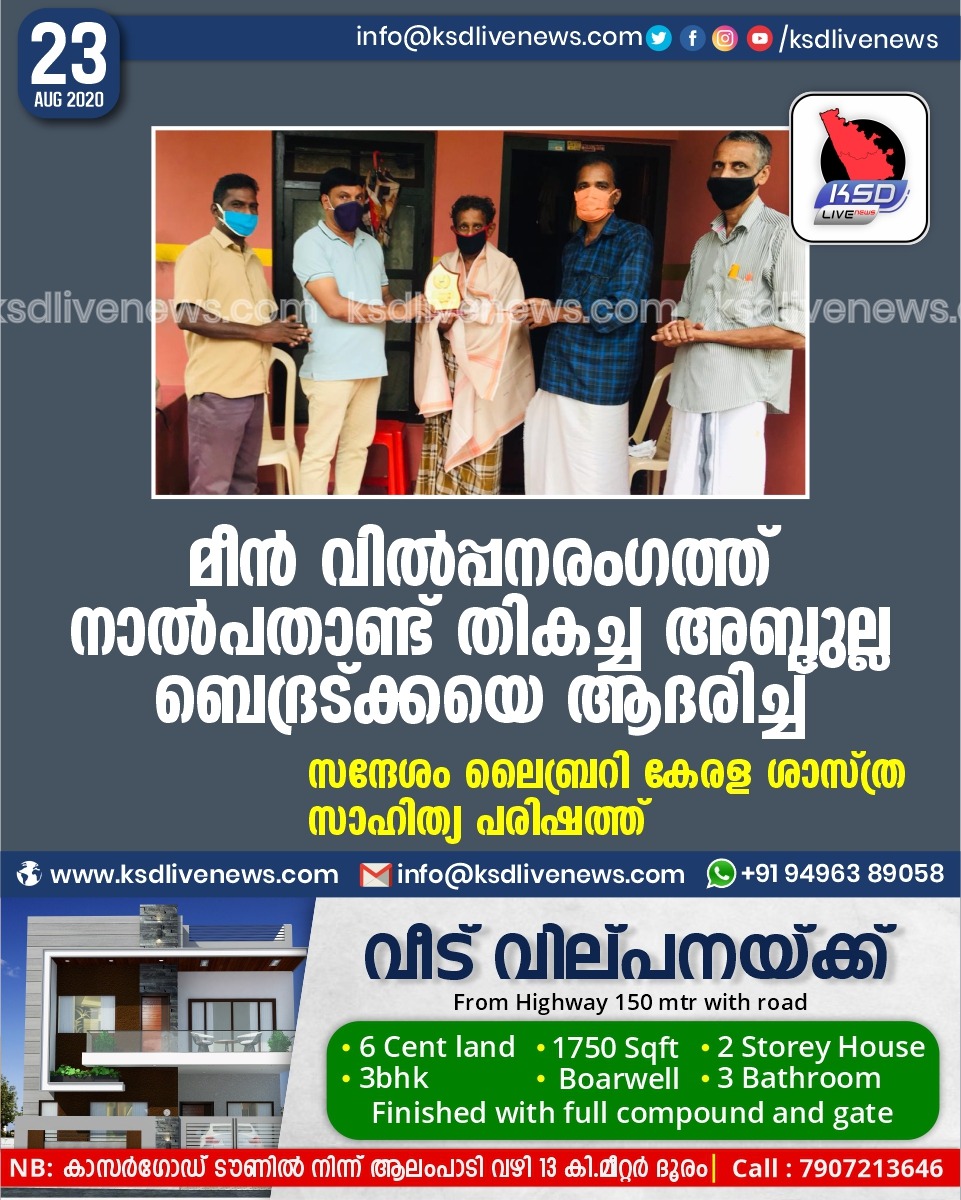 പ്രാദേശികം മീൻ വിൽപ്പനരംഗത്ത് നാൽപതാണ്ട് തികച്ച അബ്ദുല്ല ബെദ്രട്ക്കയെ ആദരിച്ച് – സന്ദേശം ലൈബ്രറി കേരള ശാസ്ത്ര സാഹിത്യ പരിഷത്ത്August 23, 2020