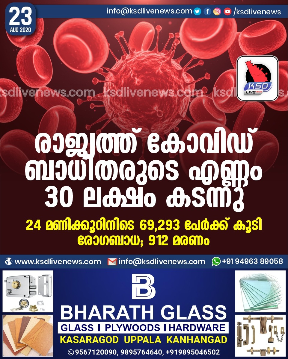 ദേശീയം രാജ്യത്ത് കോവിഡ് ബാധിതരുടെ എണ്ണം 30 ലക്ഷം കടന്നു; 24 മണിക്കൂറിനിടെ 69,293 പേർക്ക് കൂടി രോഗബാധ; 912 മരണംAugust 23, 2020