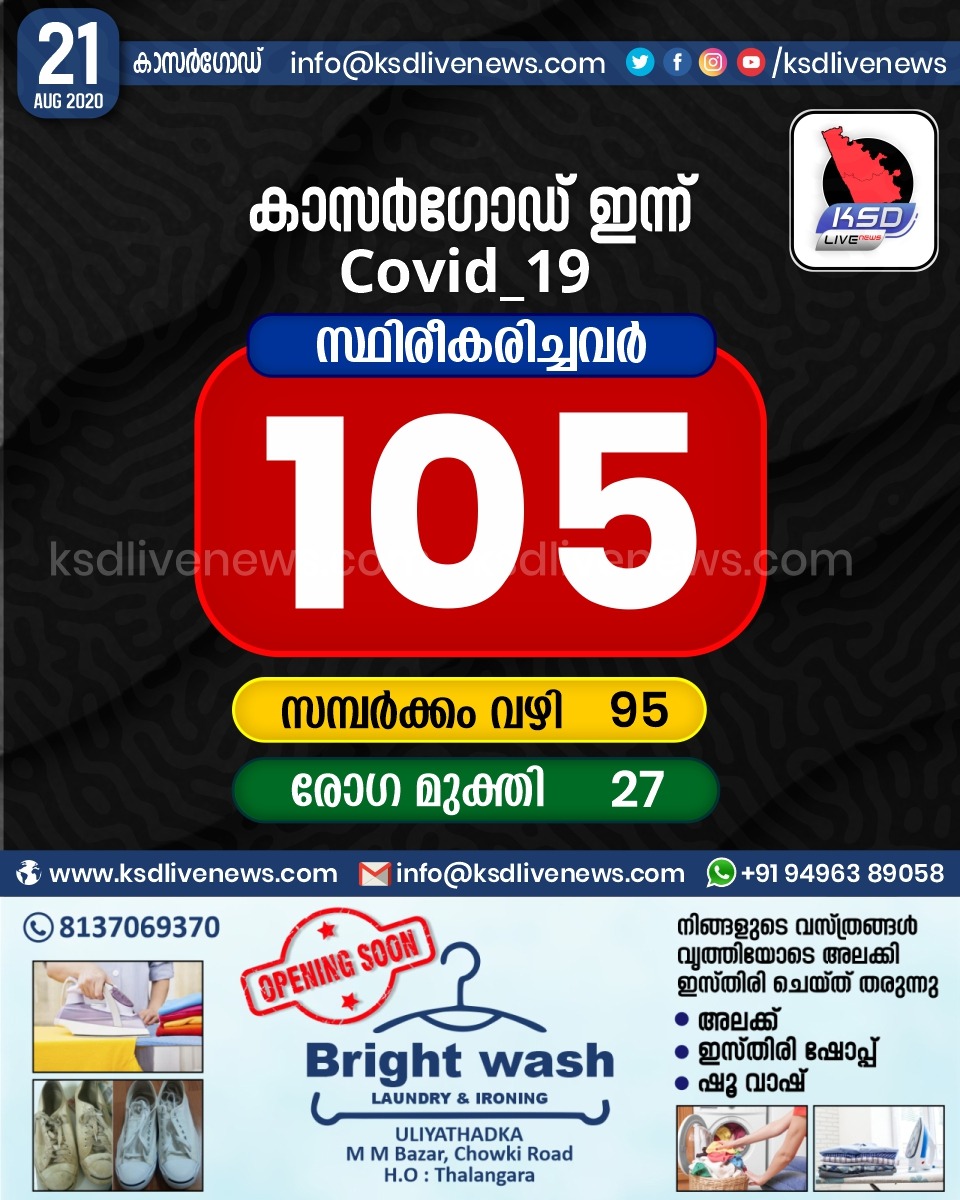 പ്രാദേശികം കാസർഗോഡ് ജില്ലയിൽ ഇന്ന് 105 പേർക്ക് കോവിഡ് സ്ഥിരീകരിച്ചു. സമ്പർക്കം വഴി 95 പേർക്കും. 27 പേർക്ക് രോഗ മുക്തിAugust 21, 2020