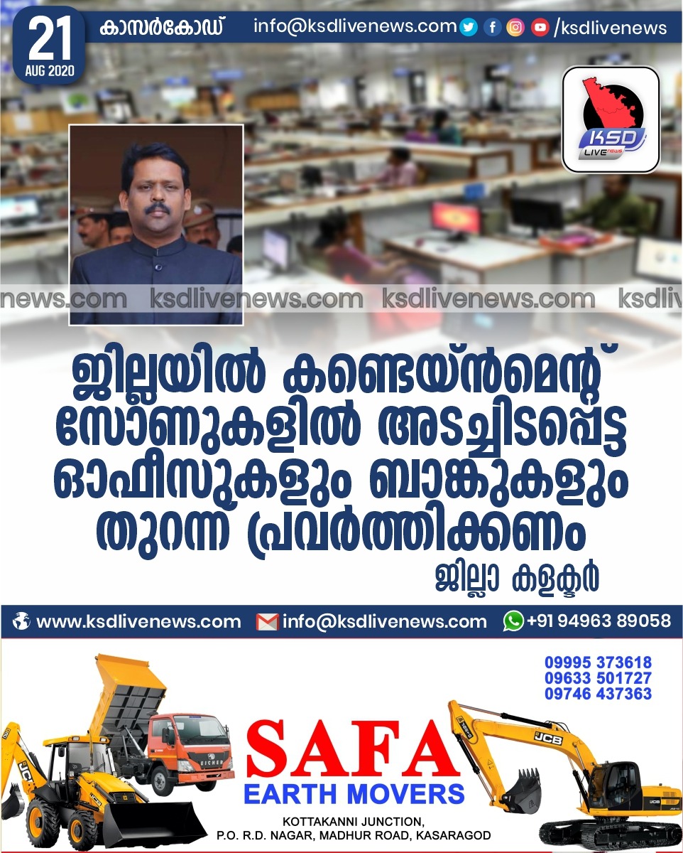 പ്രാദേശികം ജില്ലയിൽ കണ്ടെയ്ന്മെന്റ് സോണുകളിൽ അടച്ചിടപ്പെട്ട ഓഫീസുകളും ബാങ്കുകളും തുറന്ന് പ്രവര്ത്തിക്കണംജില്ലാ കളക്ടർAugust 21, 2020