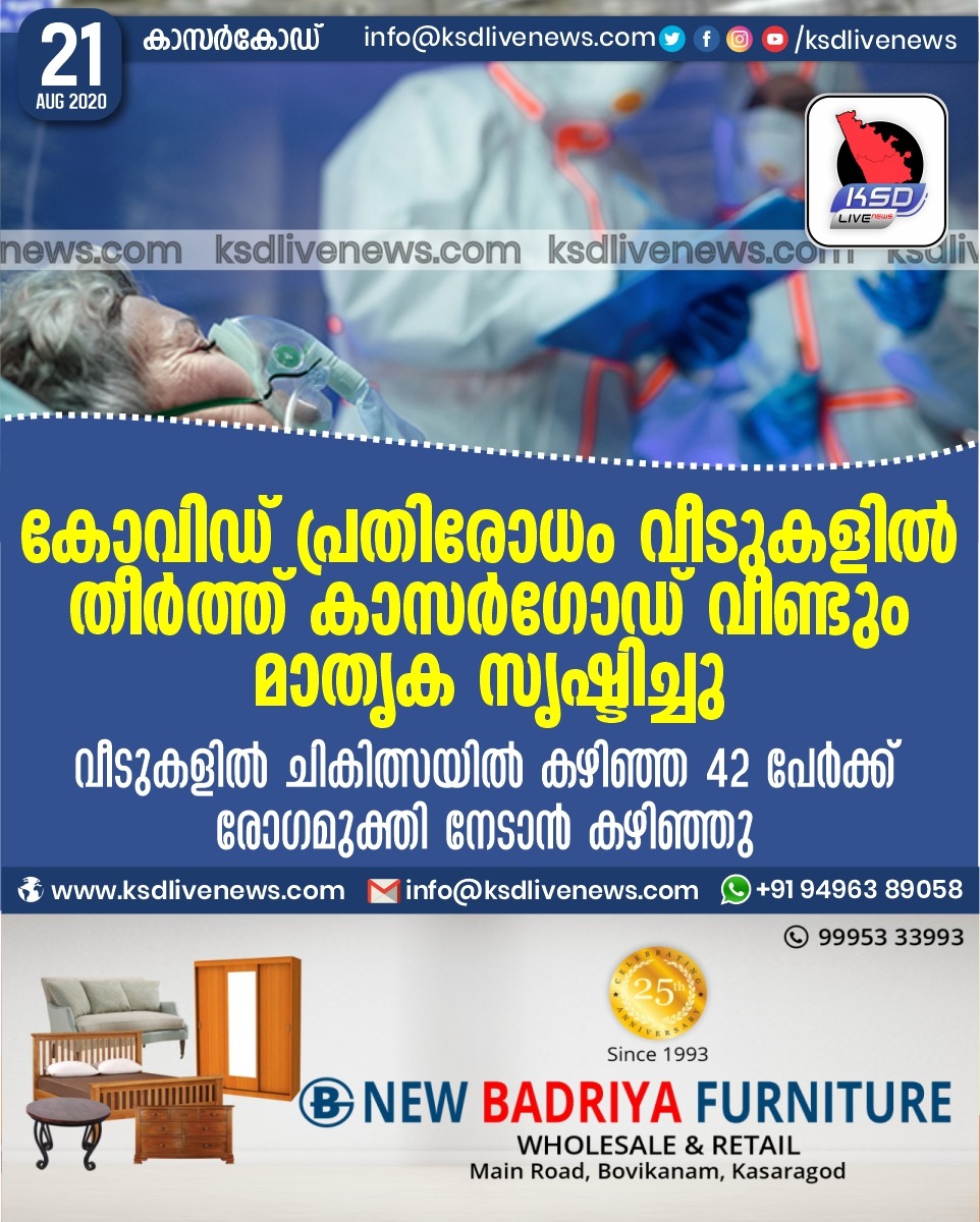 പ്രാദേശികം കോവിഡ് പ്രതിരോധം വീടുകളിൽ തീർത്ത് കാസർഗോഡ് വീണ്ടും മാതൃക സൃഷ്ടിച്ചു;വീടുകളില് ചികിത്സയില് കഴിഞ്ഞ 42 പേര്ക്ക് രോഗമുക്തി നേടാൻ കഴിഞ്ഞുAugust 21, 2020