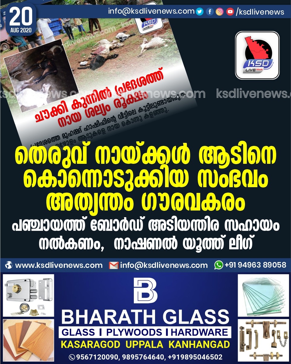 പ്രാദേശികം തെരുവ് നായ്ക്കൾ ആടിനെ കൊന്നൊടുക്കിയ സംഭവം അത്യന്തം ഗൗരവകരം;പഞ്ചായത്ത് ബോർഡ് അടിയന്തര സഹായം ഉടമക്ക് നൽകണം, നാഷണൽ യൂത്ത് ലീഗ്August 20, 2020