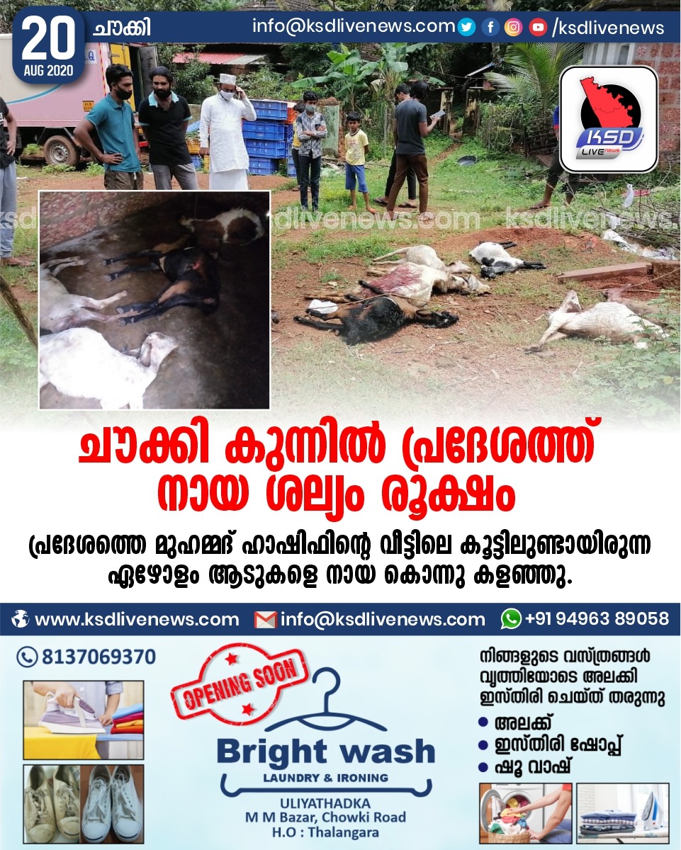 പ്രാദേശികം ചൗക്കി കുന്നിൽ പ്രദേശത്ത് നായ ശല്യം രൂക്ഷം; പ്രദേശത്തെ മുഹമ്മദ് ഹാഷിഫിന്റെ വീട്ടിലെ കൂട്ടിലുണ്ടായിരുന്ന ഏഴോളം ആടുകളെ നായ കൊന്നു കളഞ്ഞു.August 20, 2020