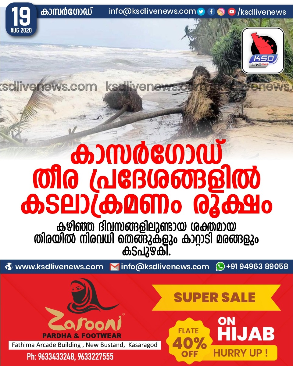 പ്രാദേശികം കാസർഗോഡ്തീര പ്രദേശങ്ങളിൽ കടലാക്രമണം രൂക്ഷം,കഴിഞ്ഞ ദിവസങ്ങളിലുണ്ടായ ശക്തമായ തിരയിൽ നിരവധി തെങ്ങുകളും കാറ്റാടി മരങ്ങളും കടപുഴകി.August 19, 2020