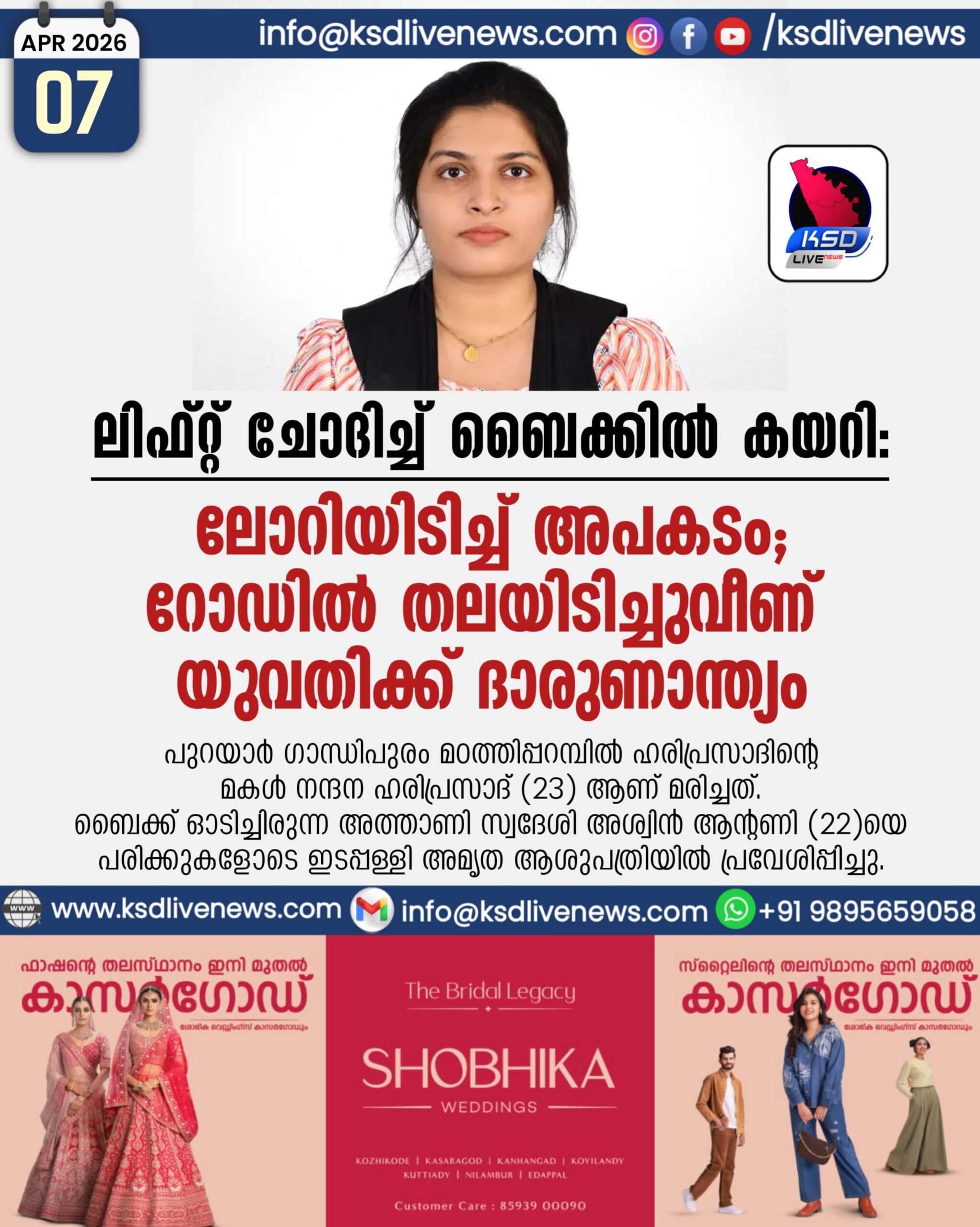 ലിഫ്റ്റ് ചോദിച്ച് ബൈക്കിൽ കയറി, ലോറിയിടിച്ച് അപകടം; റോഡിൽ തലയിടിച്ചുവീണ് യുവതിക്ക് ദാരുണാന്ത്യം