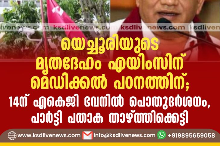 ദേശീയം യെച്ചൂരിയുടെ മൃതദേഹം എയിംസിന് മെഡിക്കല് പഠനത്തിന്, 14ന് എകെജി ഭവനില് പൊതുദര്ശനം, പാര്ട്ടി പതാക താഴ്ത്തിക്കെട്ടിSeptember 12, 2024