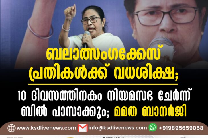 ദേശീയം ബലാത്സംഗക്കേസ് പ്രതികൾക്ക് വധശിക്ഷ; 10 ദിവസത്തിനകം നിയമസഭ ചേര്ന്ന് ബില് പാസാക്കും – മമത ബാനർജിAugust 28, 2024