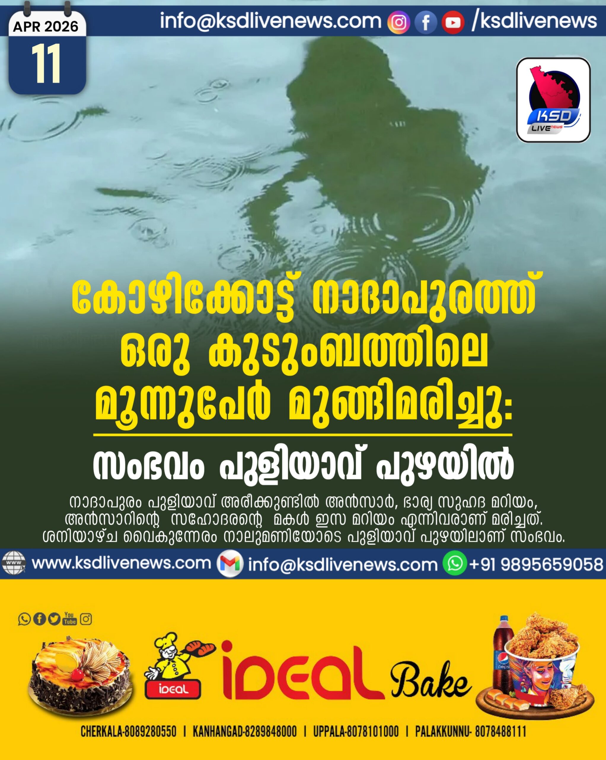 കോഴിക്കോട്ട് നാദാപുരത്ത് ഒരു കുടുംബത്തിലെ മൂന്നുപേർ മുങ്ങിമരിച്ചു; സംഭവം പുളിയാവ് പുഴയിൽ