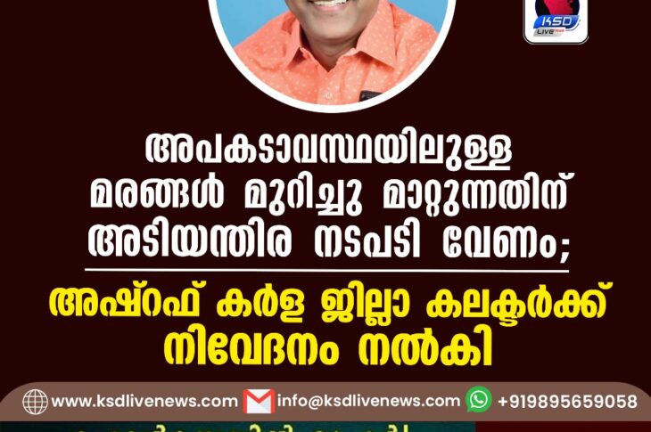 പ്രാദേശികം അപകടാവസ്ഥയിലുള്ള മരങ്ങൾ മുറിച്ചു മാറ്റുന്നതിന് അടിയന്തിര നടപടി വേണം; അഷ്റഫ് കർള ജില്ലാ കലക്ടർക്ക് നിവേദനം നൽകിJuly 30, 2024