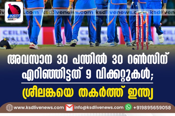 കായികം അവസാന 30 പന്തില് 30 റണ്സിന് എറിഞ്ഞിട്ടത് 9 വിക്കറ്റുകള്; ശ്രീലങ്കയെ തകര്ത്ത് ഇന്ത്യJuly 27, 2024