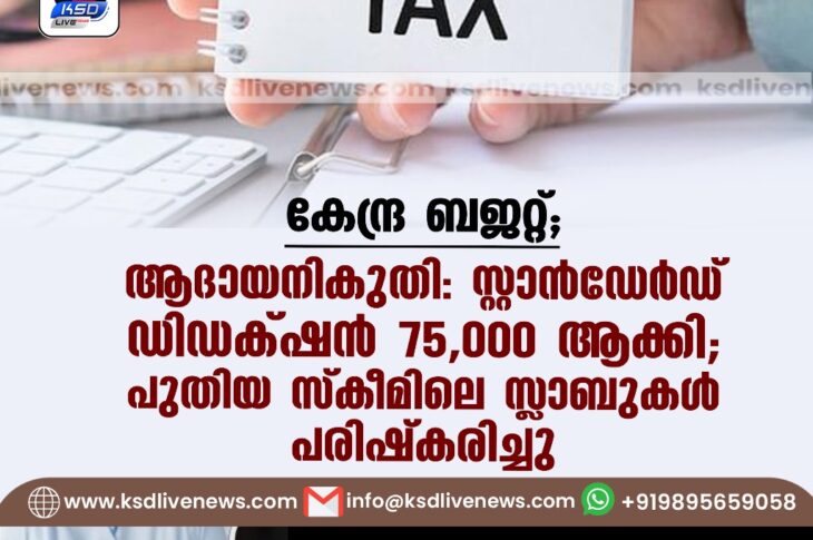 ദേശീയം കേന്ദ്ര ബജറ്റ്; ആദായനികുതി: സ്റ്റാൻഡേർഡ് ഡിഡക്ഷൻ 75,000 ആക്കി; പുതിയ സ്കീമിലെ സ്ലാബുകൾ പരിഷ്കരിച്ചുJuly 23, 2024