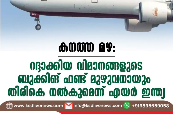 ദേശീയം കനത്ത മഴ: റദ്ദാക്കിയ വിമാനങ്ങളുടെ ബുക്കിങ് ഫണ്ട് മുഴുവനായും തിരികെ നല്കുമെന്ന് എയര് ഇന്ത്യJuly 22, 2024