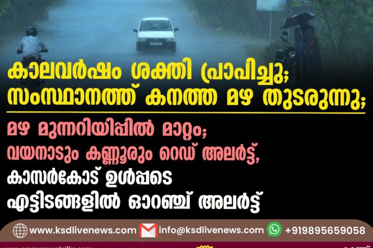 കേരളം കാലവർഷം ശക്തി പ്രാപിച്ചു; സംസ്ഥാനത്ത് കനത്ത മഴ തുടരുന്നു; മഴ മുന്നറിയിപ്പിൽ മാറ്റം; വയനാടും കണ്ണൂരും റെഡ് അലർട്ട്, കാസർകോട് ഉൾപ്പടെ എട്ടിടങ്ങളിൽ ഓറഞ്ച് അലർട്ട്July 18, 2024