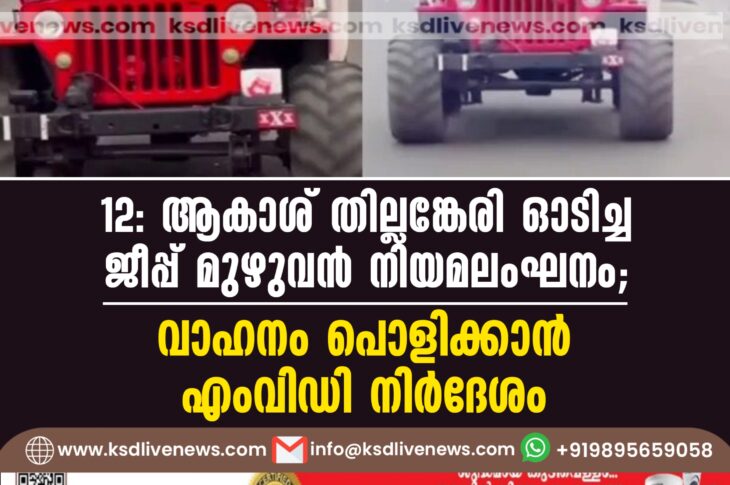 കേരളം 12: ആകാശ് തില്ലങ്കേരി ഓടിച്ച ജീപ്പ് മുഴുവൻ നിയമലംഘനം; വാഹനം പൊളിക്കാൻ എംവിഡി നിര്ദേശംJuly 12, 2024