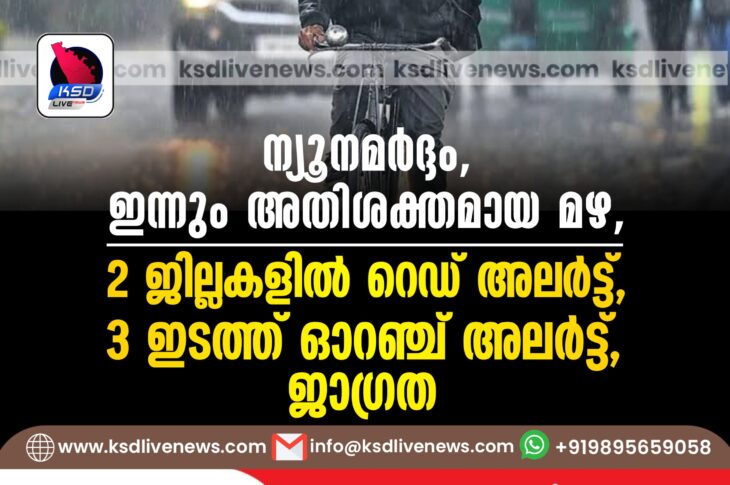 കേരളം ന്യൂനമർദ്ദം, ഇന്നും അതിശക്തമായ മഴ, 2 ജില്ലകളിൽ റെഡ് അലര്ട്ട്, 3 ഇടത്ത് ഓറഞ്ച് അലർട്ട്, ജാഗ്രതMay 24, 2024