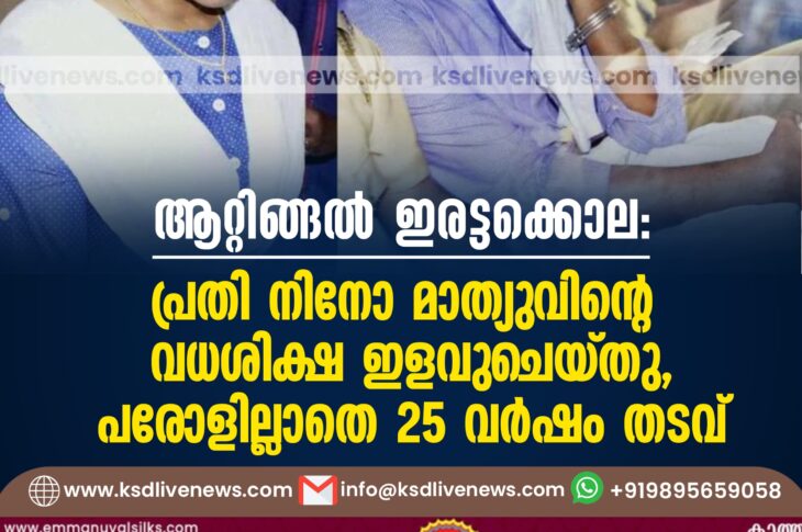 കേരളം ആറ്റിങ്ങൽ ഇരട്ടക്കൊല: പ്രതി നിനോ മാത്യുവിന്റെ വധശിക്ഷ ഇളവുചെയ്തു, പരോളില്ലാതെ 25 വർഷം തടവ്May 24, 2024