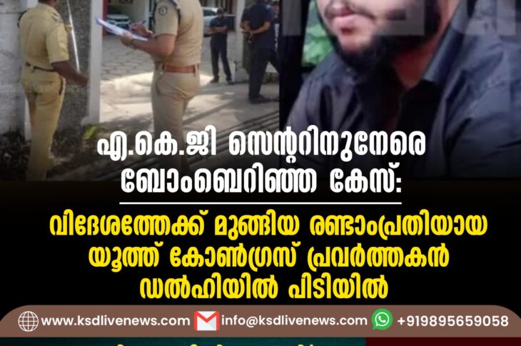 കേരളം എ.കെ.ജി സെന്ററിനുനേരെ ബോംബെറിഞ്ഞ കേസ്: വിദേശത്തേക്ക് മുങ്ങിയ രണ്ടാംപ്രതിയായ യൂത്ത് കോൺഗ്രസ് പ്രവർത്തകൻ ഡല്ഹിയില് പിടിയില്July 2, 2024