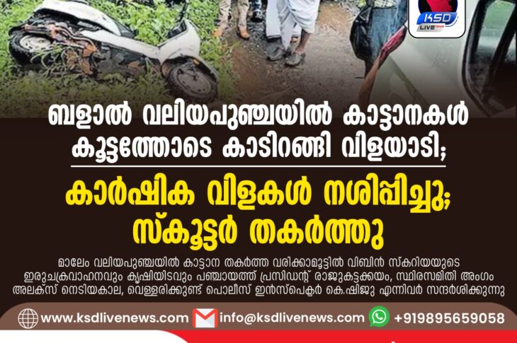 പ്രാദേശികം ബളാൽ വലിയപുഞ്ചയിൽ കാട്ടാനകൾ കൂട്ടത്തോടെ കാടിറങ്ങി വിളയാടി; കാർഷിക വിളകൾ നശിപ്പിച്ചു; സ്കൂട്ടർ തകർത്തുJuly 1, 2024