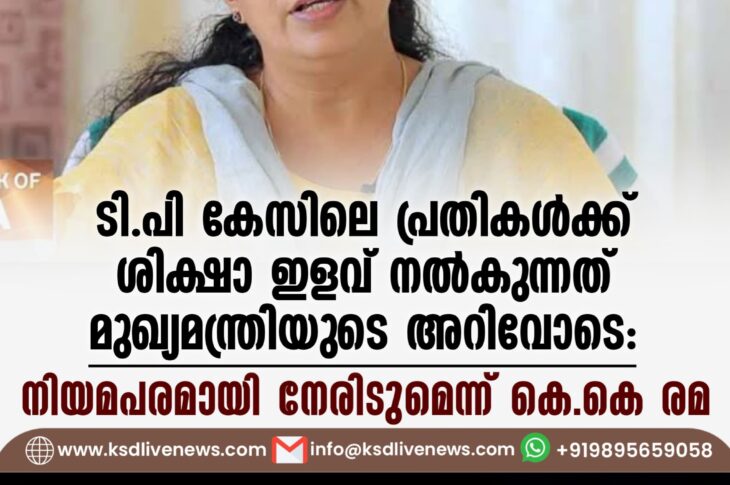 കേരളം ടി.പി കേസിലെ പ്രതികൾക്ക് ശിക്ഷാ ഇളവ് നൽകുന്നത് മുഖ്യമന്ത്രിയുടെ അറിവോടെ’; നിയമപരമായി നേരിടുമെന്ന് കെ.കെ രമJune 22, 2024