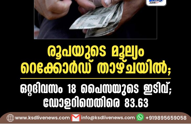 ദേശീയം രൂപയുടെ മൂല്യം റെക്കോര്ഡ് താഴ്ചയില്, ഒറ്റദിവസം 18 പൈസയുടെ ഇടിവ്; ഡോളറിനെതിരെ 83.63June 20, 2024