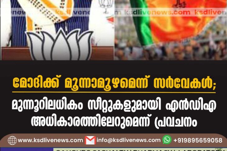 ദേശീയം മോദിക്ക് മൂന്നാമൂഴമെന്ന് സർവേകൾ; മുന്നൂറിലധികം സീറ്റുകളുമായി എന്ഡിഎ അധികാരത്തിലേറുമെന്ന് പ്രവചനംJune 2, 2024
