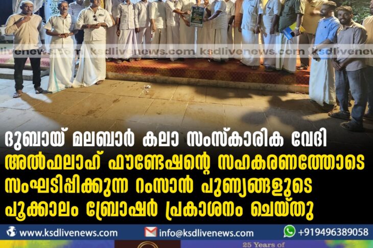 പ്രാദേശികം ദുബായ് മലബാർ കലാ സംസ്കാരിക വേദി അൽഫലാഹ് ഫൗണ്ടേഷന്റെ സഹകരണത്തോടെ സംഘടിപ്പിക്കുന്ന റംസാൻ പുണ്യങ്ങളുടെ പൂക്കാലം ബ്രോഷർ പ്രകാശനം ചെയ്തുMarch 20, 2024