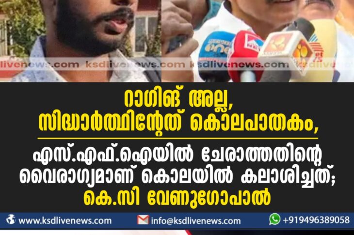 കേരളം റാഗിങ് അല്ല, സിദ്ധാർത്ഥിൻ്റേത് കൊലപാതകം, എസ്.എഫ്.ഐയിൽ ചേരാത്തതിന്റെ വൈരാഗ്യമാണ് കൊലയിൽ കലാശിച്ചത്; കെ.സി വേണുഗോപാൽMarch 1, 2024