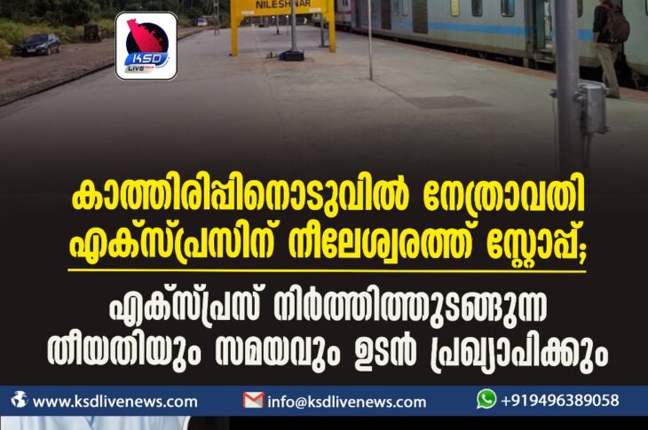 കാസർഗോഡ് കാത്തിരിപ്പിനൊടുവിൽ നേത്രാവതി എക്സ്പ്രസിന് നീലേശ്വരത്ത് സ്റ്റോപ്പ്; എക്സ്പ്രസ് നിർത്തിത്തുടങ്ങുന്ന തീയതിയും സമയവും ഉടൻ പ്രഖ്യാപിക്കുംFebruary 7, 2024